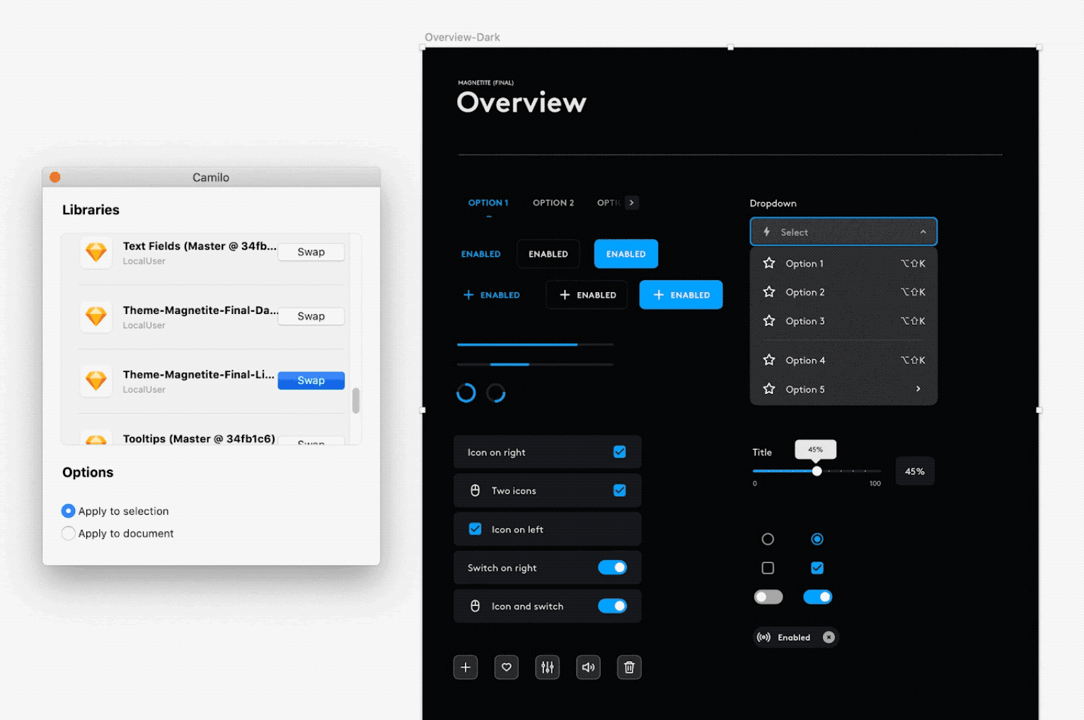 We used Camilo, a Sketch plug-in to switch between themes. As we have properly built the color libraries and linked them to the components, theme switching is just by a click.