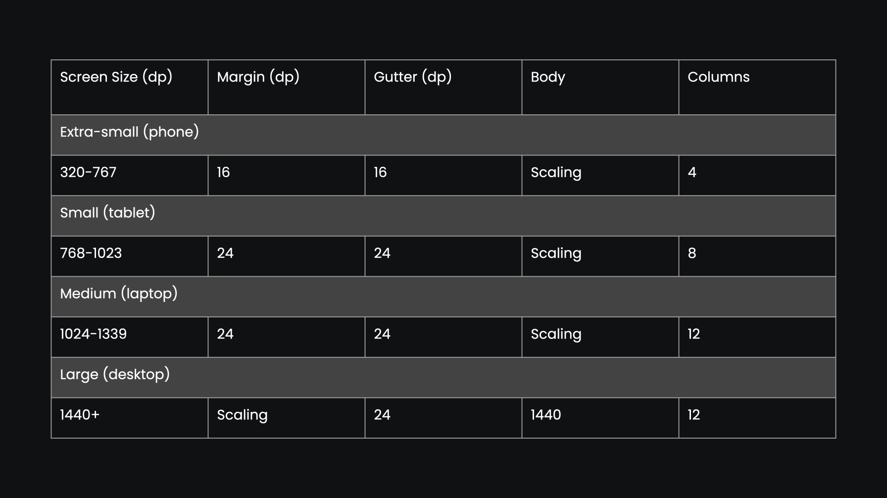 4 breakpoints, and 12, 8, 4 column layout grid.