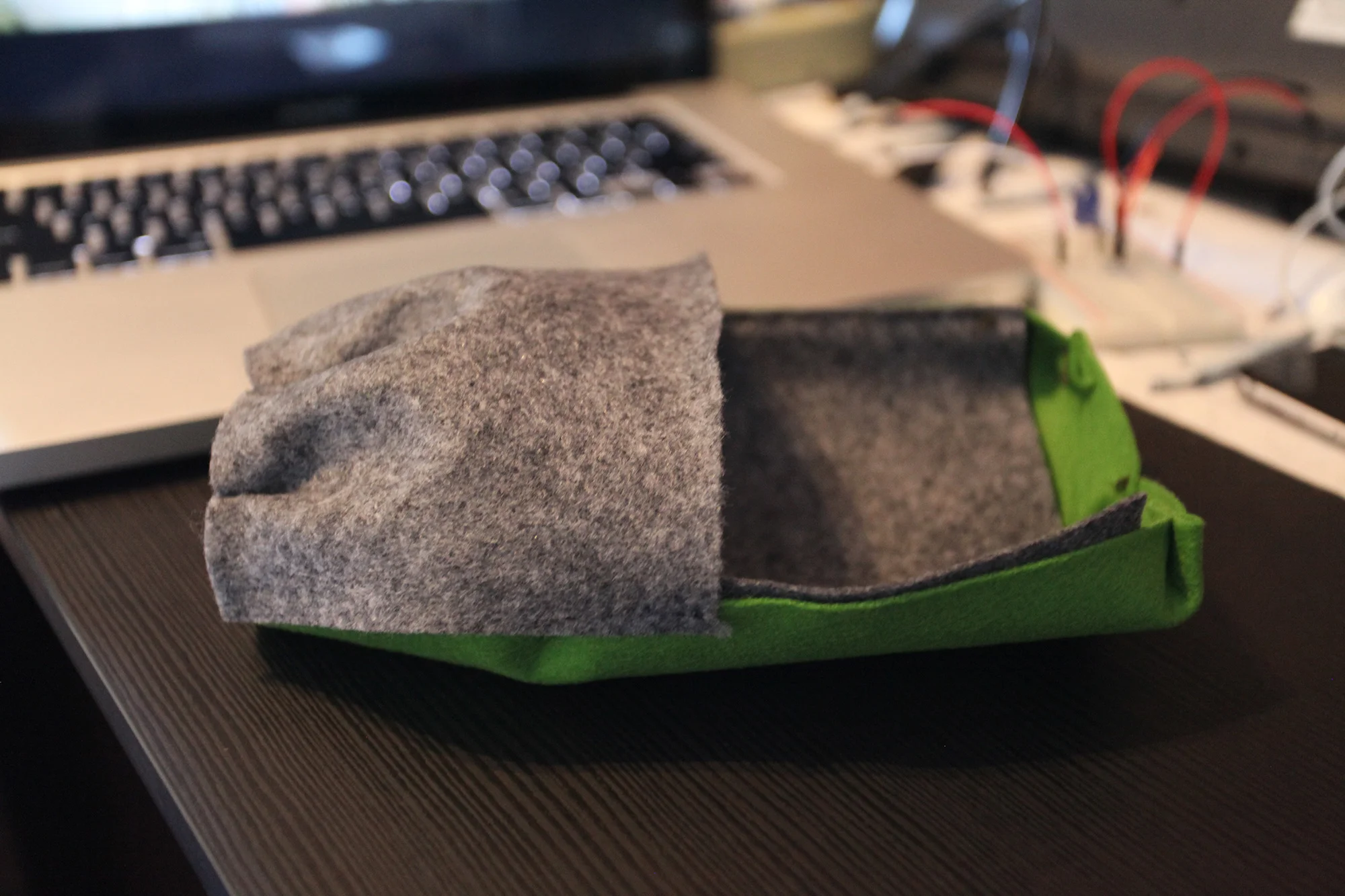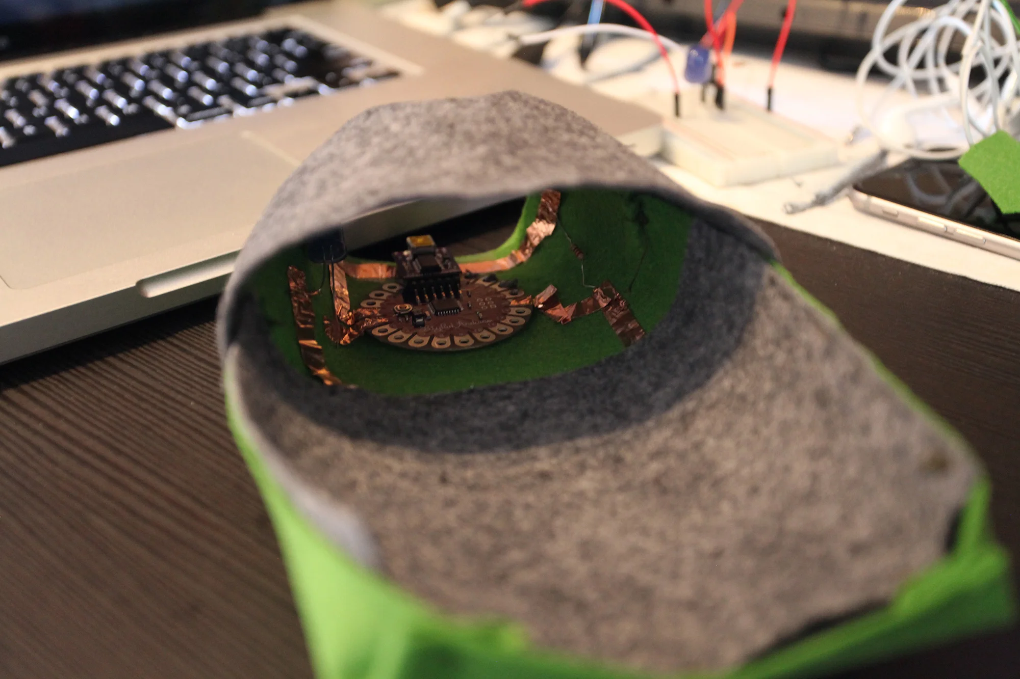 There are a press sensor made by myself on the sole of this shoe, a LED and a LilyPad Arduino. When users step on it, it can trigger sounds through GarageBand.